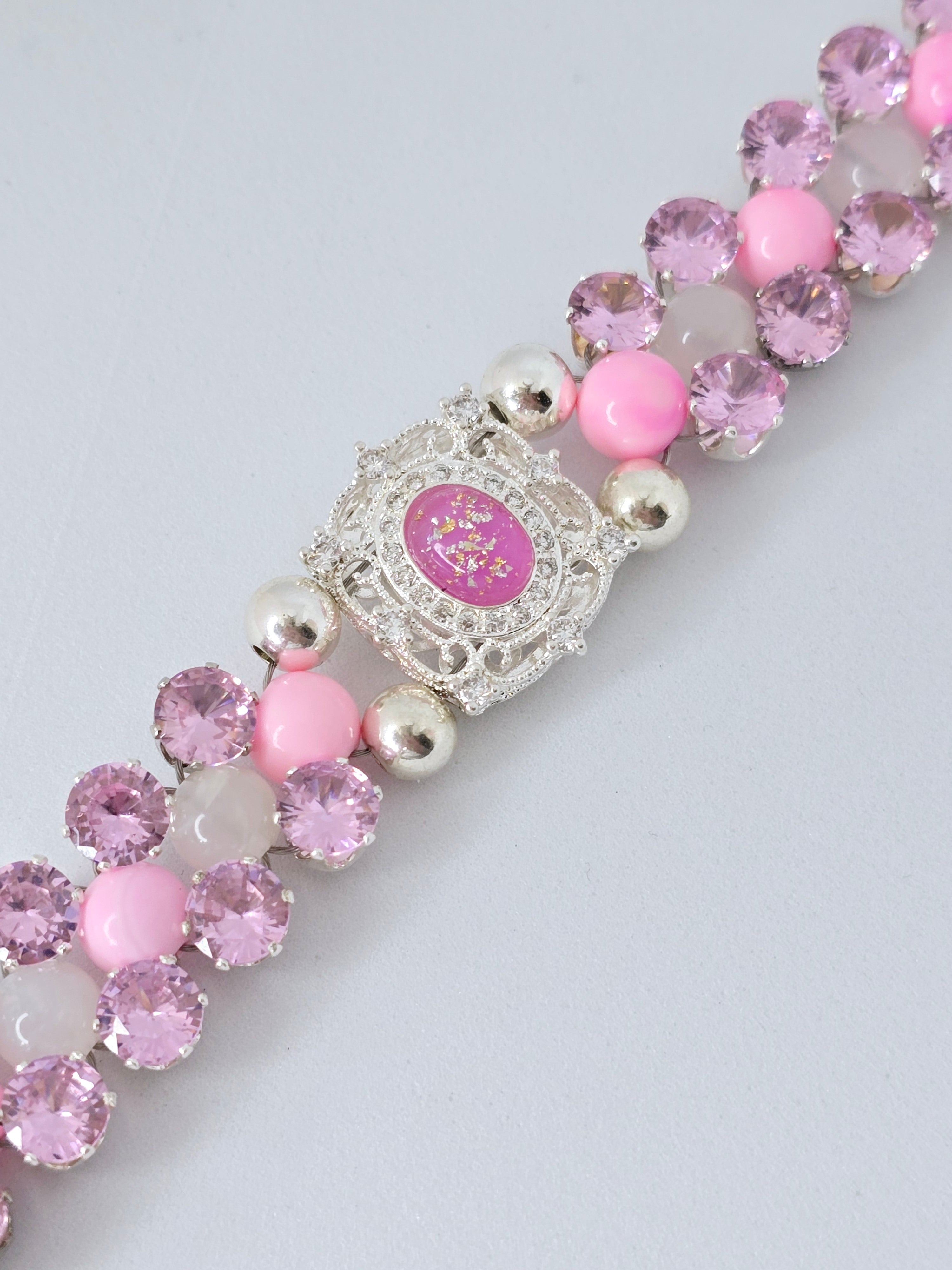 The bracelet also features pink rhinestones that add a pop of color and sparkle to the design. They are known for their ability to attract positive energy and enhance the wearer's confidence. The combination of these materials creates a stunning piece of jewelry that is both elegant and eye-catching.