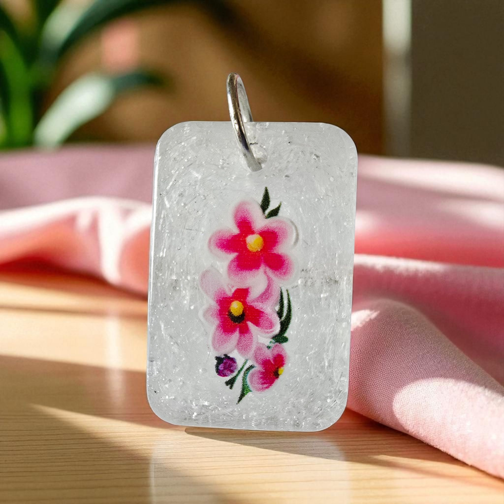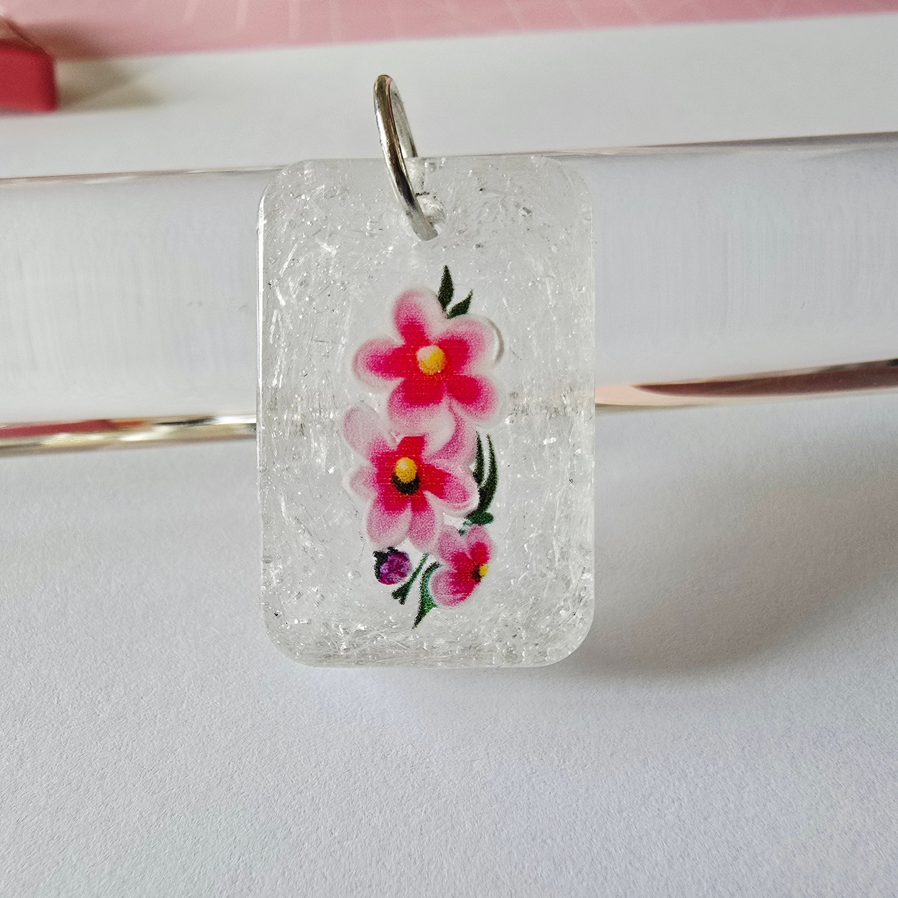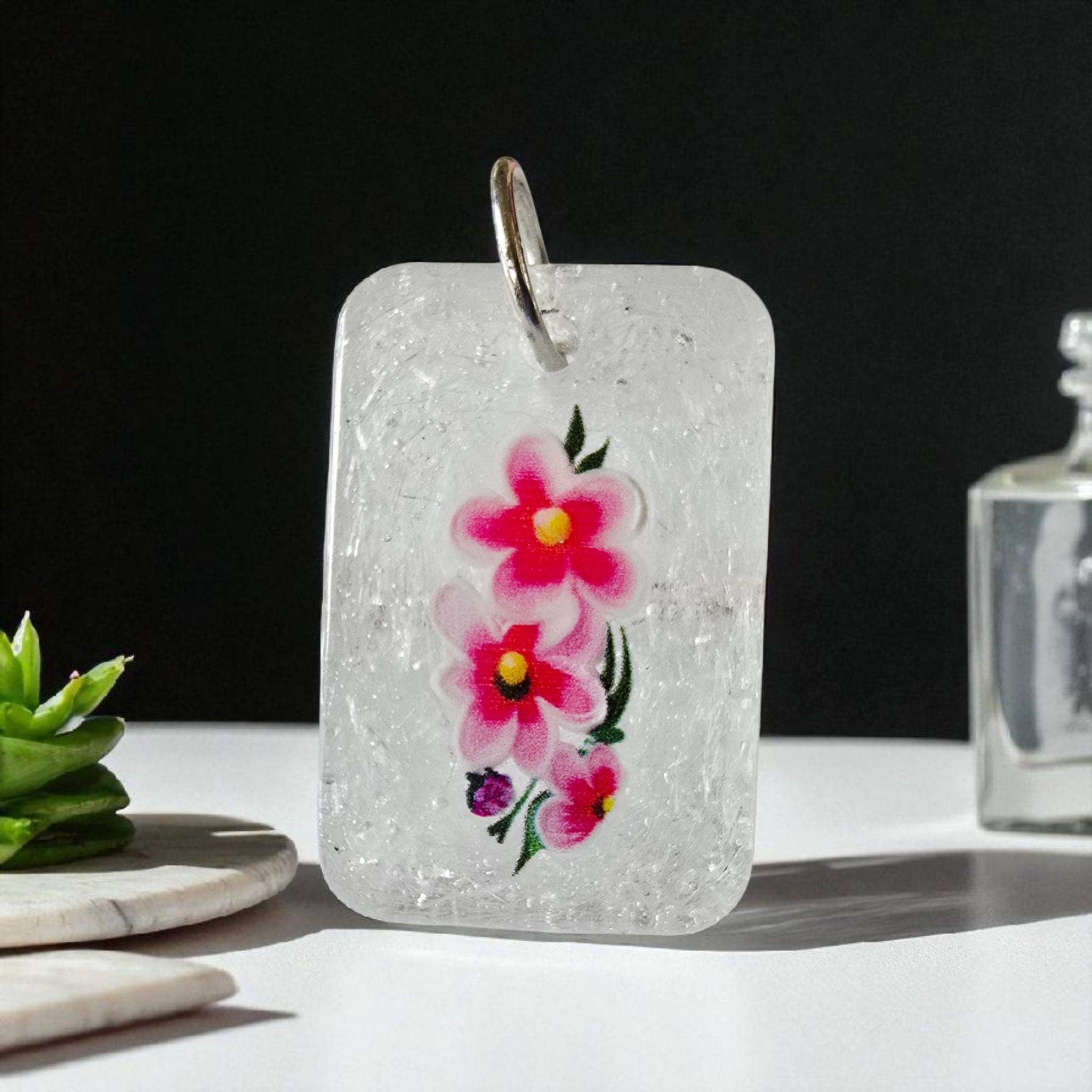 This stunning clear glitter resin pendant is sure to make a statement. The sparkly finish catches the light and adds a touch of glamour to any outfit. Embellished with delicate flowers, this pendant adds a feminine touch to any look. Shine bright with this dazzling accessory.